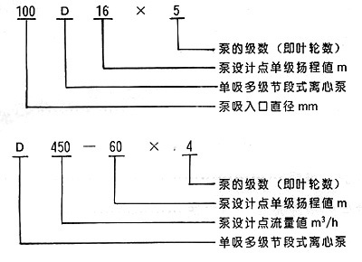 注:D(DF多级耐腐蚀离心泵、DY多级离心油泵、MD多级耐磨离心泵)80-30为习惯表示方法,其中80表示泵吸入口直径为80mm,30表示泵设计点单级扬程为30m,其它含义与上述表示方法相同。