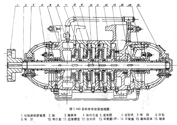 MD系列泵系卧式、单吸、分段式多级离心泵,吸入口为水平方向,吐出口与水平垂直向上。泵的进水段、中段、出水段、轴承体待泵壳体部分通过拉紧螺栓联成一体,并根据泵的扬程选择泵的级数。