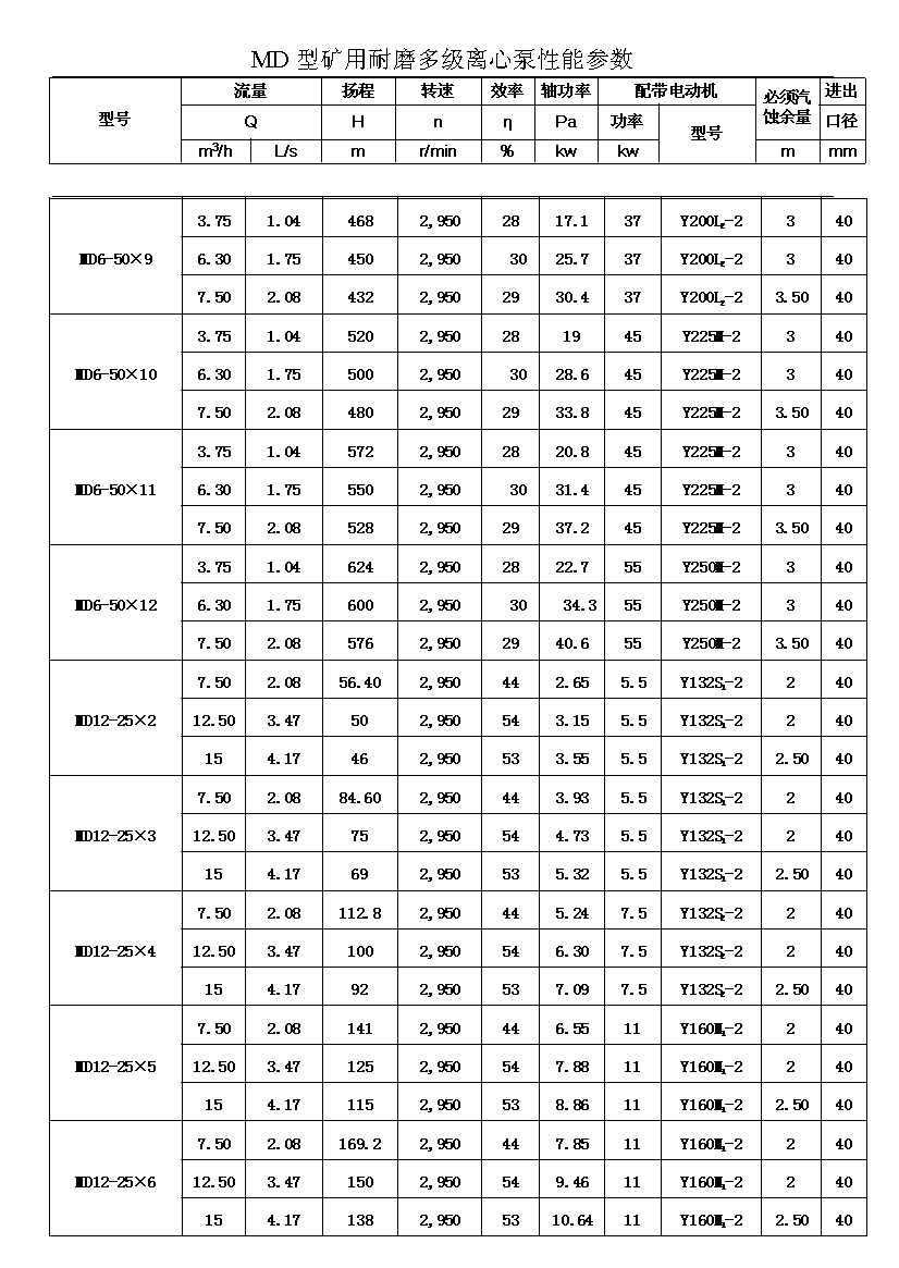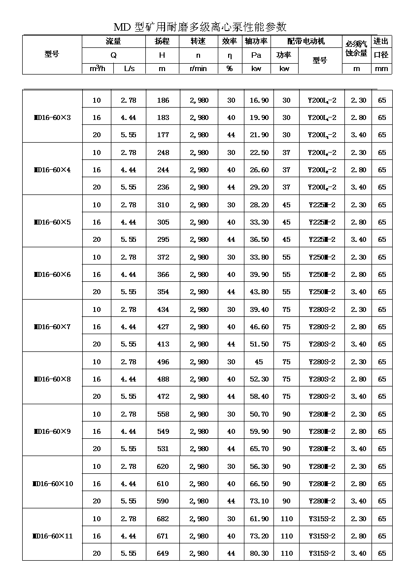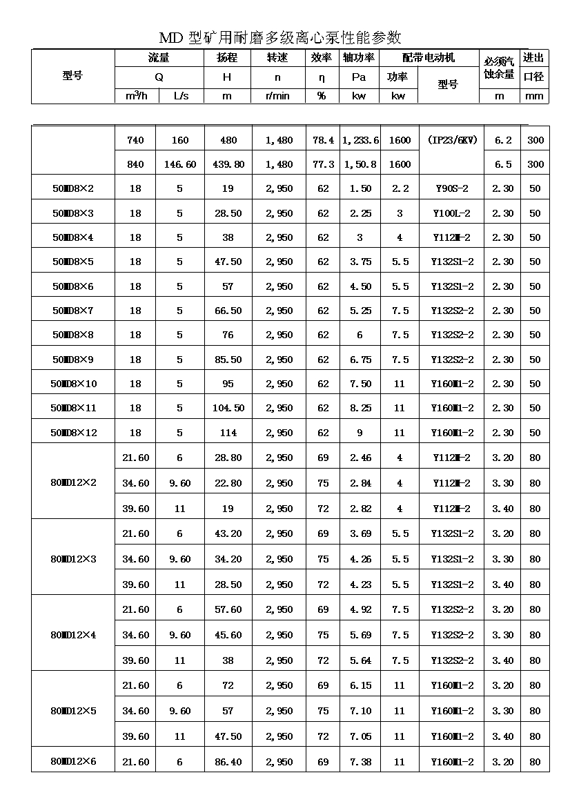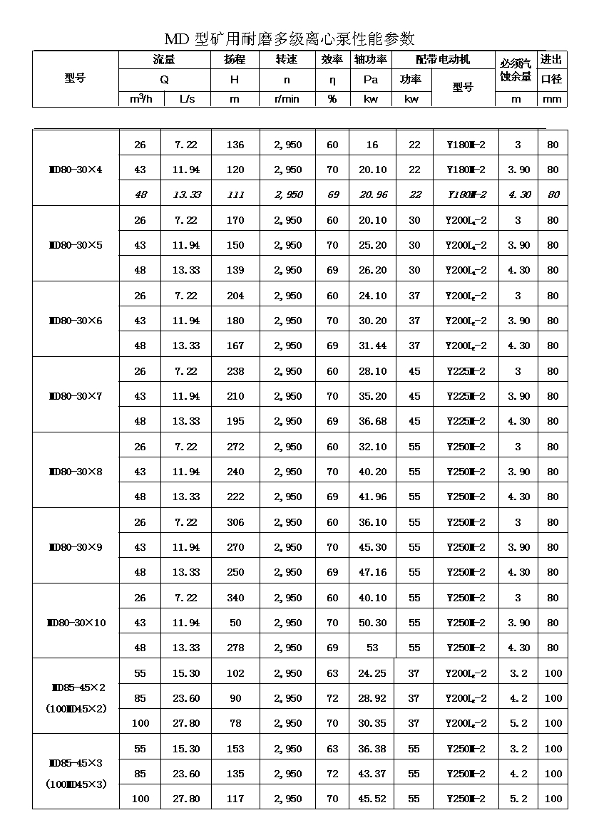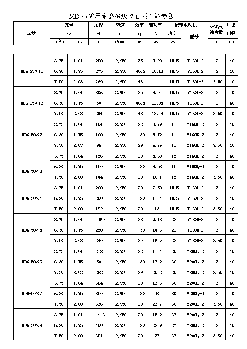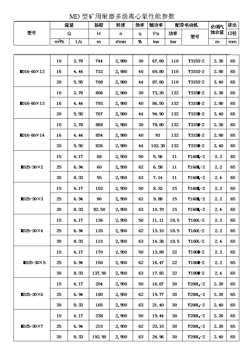 MD型耐磨多级离心泵,是我公司在D型单吸多级清水离心泵的基础上,改造设计的一种耐磨多级离心泵。MD型耐磨多级离心泵,高效节能,耐磨可靠,寿命长, 特别适用于矿山排水,抽送固体颗粒含量不大于1.5%(颗粒直径小于0.5毫米)的矿井水及其他类似液体,液体温度不高于80度。