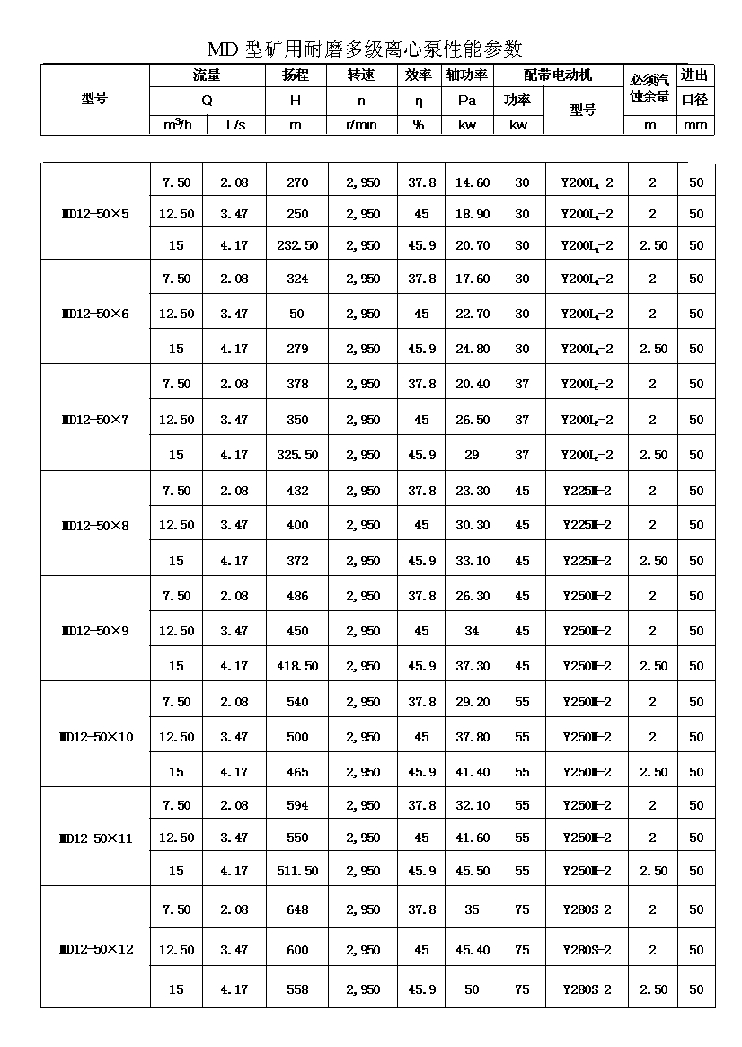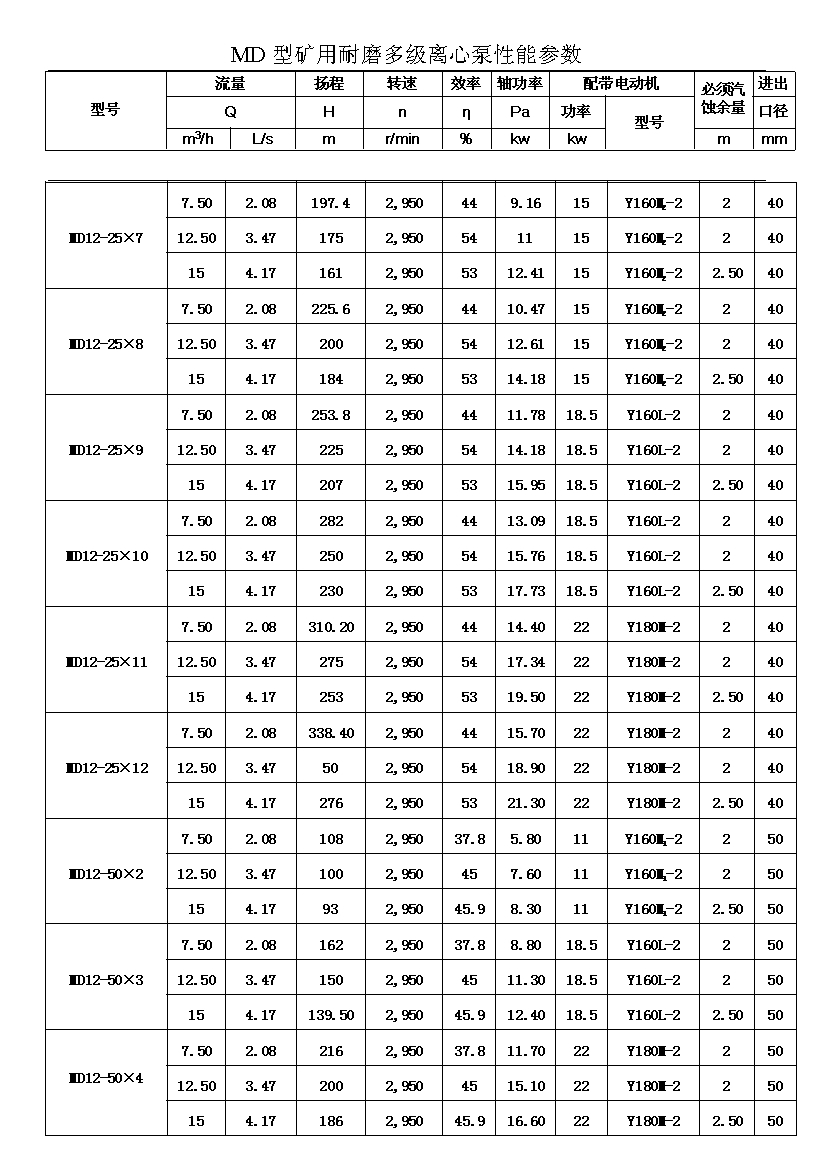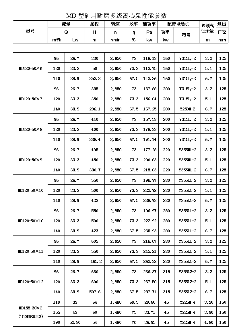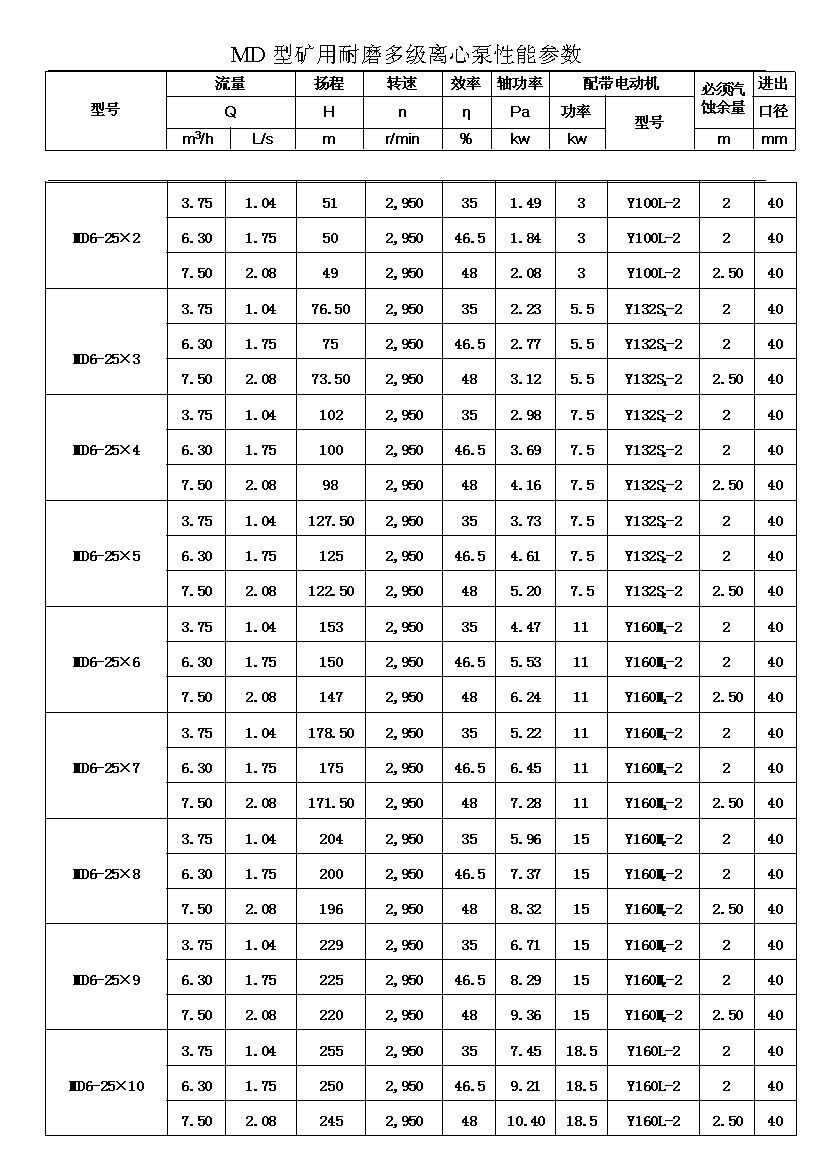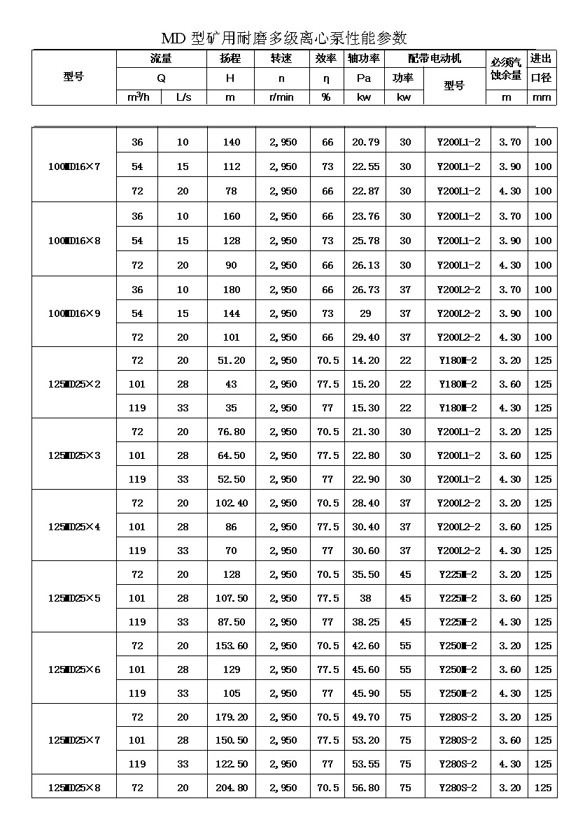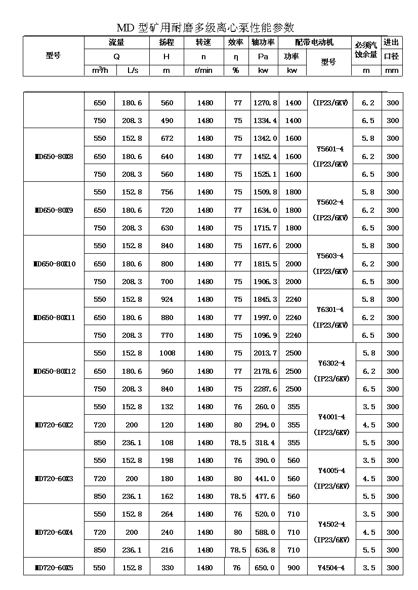 MD型耐磨多级离心泵,是我公司在D型单吸多级清水离心泵的基础上,改造设计的一种耐磨多级离心泵。MD型耐磨多级离心泵,高效节能,耐磨可靠,寿命长, 特别适用于矿山排水,抽送固体颗粒含量不大于1.5%(颗粒直径小于0.5毫米)的矿井水及其他类似液体,液体温度不高于80度。