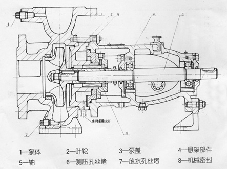 IY系列单级单吸热水离心泵的主要零件有泵体、叶轮、泵盖、悬架部件,机械密封部件、轴等。