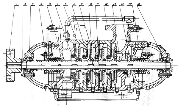 泵壳体部分主要由轴承、前段、中段、后段、导叶等用螺栓联接成整体,